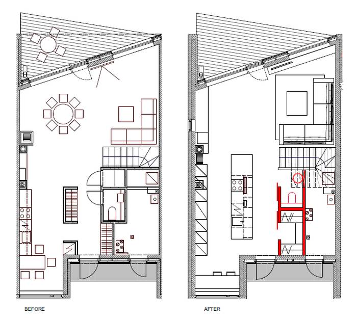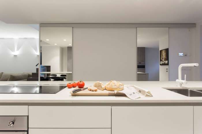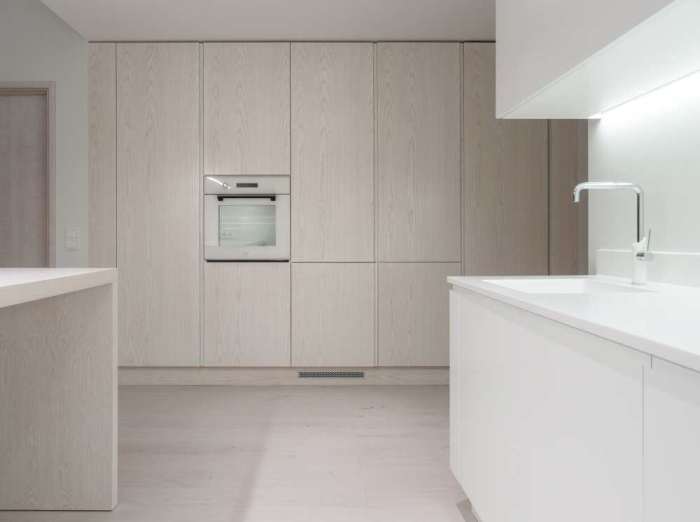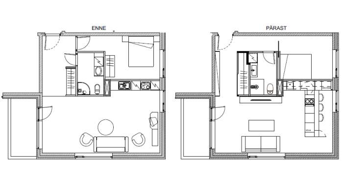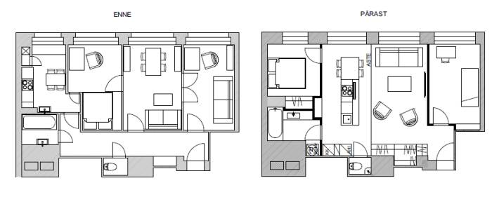 The value of an apartment lies in thoughtful planning, not merely in a good location nor a beautiful view 02/2016 Involved expert:Aet Piel Jaga: New flats on sale are usually advertised for a great location, good architecture and a unique view. Interior architect Aet Piel said that it is quite usual that the plannings has been overlooked. Home buyers look for the number of rooms and overall square meters, not considering the use of space nor the placement of furniture. Furniture arrangement should be put in place in the initial stages of house planning, collaboration with an architect and interior designer is crucial, for not only in private houses but also in apartments. This becomes especially important in small apartments, where every square meter really needs to be considered. Unfortunately it is very common that architect plans the space according to square meters. Interior architect on the other hand is the one who plans the use of space and placement of furniture functionally. Some, however, not all property development companies already realize the vital importance of interior design. In kitchen solutions, the furniture placement is crucial, because it is not possible to plan without thinking through the kitchen appliances precise locations and logical paths. If you believe that the apartment’s interior design is solely up to home buyers vision, it is not always the case, because the apartment is normally quite a small space for living with ready‐made solutions made beforehand. Professional input from an interior designer provides the best and sometimes the only possible solution. Modern open kitchen could have a counter or kitchen isle (the bigger the better). We should keep in mind that kitchen is a room for socializing, it is the heart of every home. Kitchen should not dominate the apartment, it’s charm should rather lie in it’s functionality, high‐quality materials and details. Kitchen decoration should blend in with colours and materials of the rest of apartment . Dark colours absorb the light in the kitchen, so dirt becomes more visible. Modern kitchen equipment, all the kitchen appliances and other furnishings ‐ lamps, chairs etc should be stylish. Kitchen is better not to be overloaded with excessive details. Often homeowners tend to do so because it is wrongly believed that integrated space, namely simple, minimalistic or monochrome kitchen is boring. In fact, the kitchen is part of the whole apartment and kitchen furniture should not be seen separately from rest of the apartement design. In this particular home and kitchen the interior architect was able to step in already during the early design process. The changes led to a home made considerably more attractive. Ground floor First floor The new materials in this kitchen are natural‐looking acrylic based or concrete‐like surfaces. Concrete, stone veneer panels, dried and weathered wood surfaces should rather belong to customized interiors rather than to private homes for their difficult day to day cleaning and maintenance. The newest thing about kitchen appliances is the hob that has an integrated air purifier with activated carbon in the middle, which means it does not require separate direct ventilation around cooking area. Above the kitchen island, instead of the suspended air ventilator on eye level, there is an alternative fully integrated fume extractor within suspended ceiling, which does not take more than 20 cm of space behind suspended ceiling. For sleek and streamlined look the handles of kitchen cabinet doors have been replaced with recessed channels on doors or with other invisible solutions. When talking about the effective use of space, the planning process should avoid excessively large corridors, and invest instead in storage areas and walk‐in closets. One should rather favour spacious living room than large bedrooms. Utility room in an apartment is an imperative, and wherever it is possible, a washing machine should be in a separate room with the rest of the household goods. Bathroom vanity or dressing table in a bathroom is just as important as work surface in the kitchen, and if necessary, the washing machine can be placed underneath it. Separate sink is quite impractical. It would be better to avoid building special plasterboard wall cabinets in children's rooms and bedrooms. In children's room one should prefer wardrobes or cabinets, which are not standard depth but rather thinner, still good for storing the clothing and all other necessary things. The usual 70 cm deep sliding door closet is not only boring but also massive and impractical for children. A very good apartment has a master bedroom connected with walk-in wardrobe closet and bathroom en suite. In apartments, as well as in private homes one should rather emphasize the different materials than colours, accentuating with curtains, textiles and lighting fixtures. Exciting vibe can be created with different materials on the walls ‐ whether the choice is ceramic tiles, decking, veneer boards, brick, concrete, wallpaper or last but not least the plaster. Here, too, one should not emphasize the colours but rather the characteristics of different materials and structures. Here are some tips and examples of how to manage with rather small changes and make one’s home much more attractive and functional. Given apartment was built in the 60's. The kitchen has been moved in the middle of the apartment and due to pipework it is now situated on a raised floor. A large kitchen island with a sink and stove and a spacious living room give this apartment completely different fresh look. These changes normally are going to cost quite a lot, despite the fact that they are in a small scale, because the open plan conversion does not consider only the walls but one has also tackle the tiles in the hallway, reconnect the water pipes and tidy the floor after dismantling the wall. A new property development transferred by small changes, ma