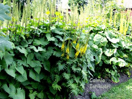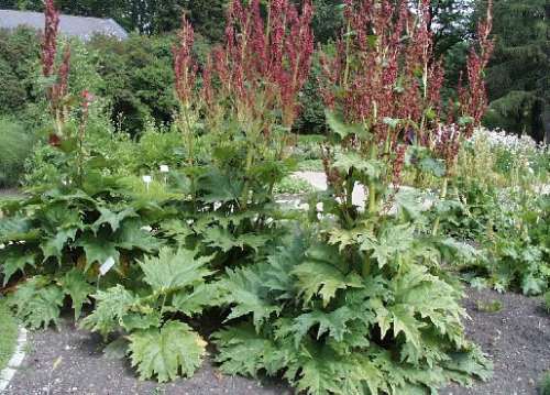 Kämmalrabarber (Rheum palmatum, allpool fotol) on tõeline hiid. Tema kasv ületab soodsates oludes 2,5 m. Tema vägevate, tumeroheliste lehtede läbimõõt ulatub 1 meetrini. Sort "Atrosanguineum" moodustab juunis kaugele paistva, tiheda, roosa kuni tumeroosa õisikuküünla. Efekti lisab veel asjaolu, et rabarbri õisik on loomult selline mittepõhjamaine, natuke isegi ebamaine.   Kämmalrabarber toob aeda troopikale omast lopsakust. "Atrosanguineum" ´i noored lehed on purpurse jumega. Vananedes kaob punane varjund lehtede pealmiselt poolelt ja jääb püsima üksnes alumisel küljel. Sordi lehtede ja õite värv on laiades piirides varieeruv sõltudes tugevasti paljundusmaterjali kvaliteedist. Tõsiselt viljakas mullas moodustab harilik rabarbergi inimesekõrguse õisiku, mis hoolimata oma plassist kollakas-rohekast värvist ikkagi pilkupüüdev on. Kasvurammu andmiseks tuleks kämmalrabarbri kasvukohale kaevata üsna lai ja sügav auk ning täita see köögijäätmete, riisutud lehtede, niidetud muru, sõnniku ja mullaga. Kihtide vahele võiks visata lisaks ka veel puutuhka ja superfosfaati. Erinevalt heleeniumist ei vaja kämmalrabarber toestamist, aga sarnaselt talle armastab päikest ja ei muutu kunagi aia nuhtluseks. Ta sobib nii soolotaimeks kui ka foonile.